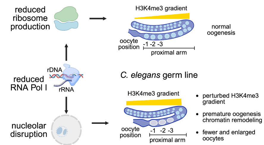 RNA Pol I activity is required for meiotic chromatin organization and the H3K4me3 gradient essential for oogenesis, independent of ribosome synthesis. Mejia-Trujillo R*, Zhao Q*, Abraham F, Rahman A, Cenik ES. bioRxiv, 2025.05.07.652530; * equal contribution. Link